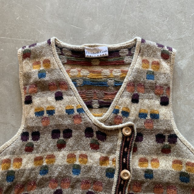 【Ladies】イングランド製 Elizabeth Gash ハンドメイド ウール×シルク ニットベスト 総柄■ビンテージ レトロ アメリカ古着 レディース